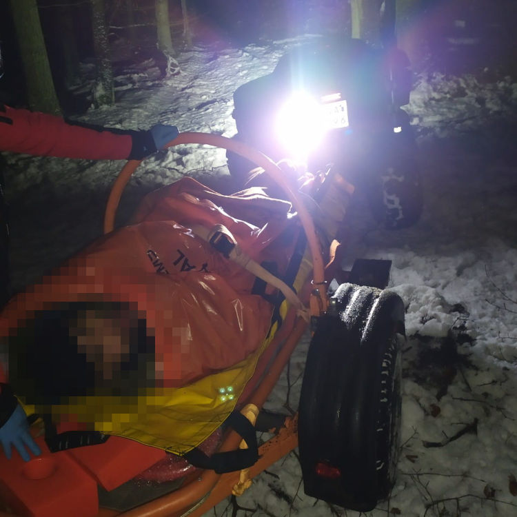 Służby urządziły poszukiwania rannego mężczyzny w lesie w okolicy Łężycy pod Gdynią. Próbowano ustalić miejsce na podstawie opisu miejsca podanego przez zaginionego. Do poszukiwań wykorzystano techniczne środki namierzania. Pomógł także policyjny pies tropiący. Mężcyzna został odnaleziony przez służby o godz. 23:15. Specjalne nosze umożliwiły jego transport z lasu do karetki.